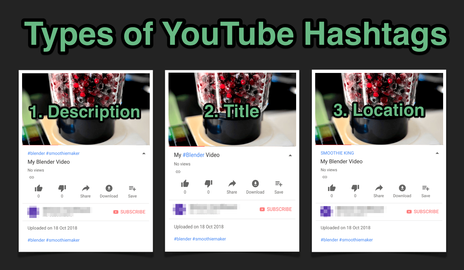 On YouTube there are three different ways how hashtags can be displayed: